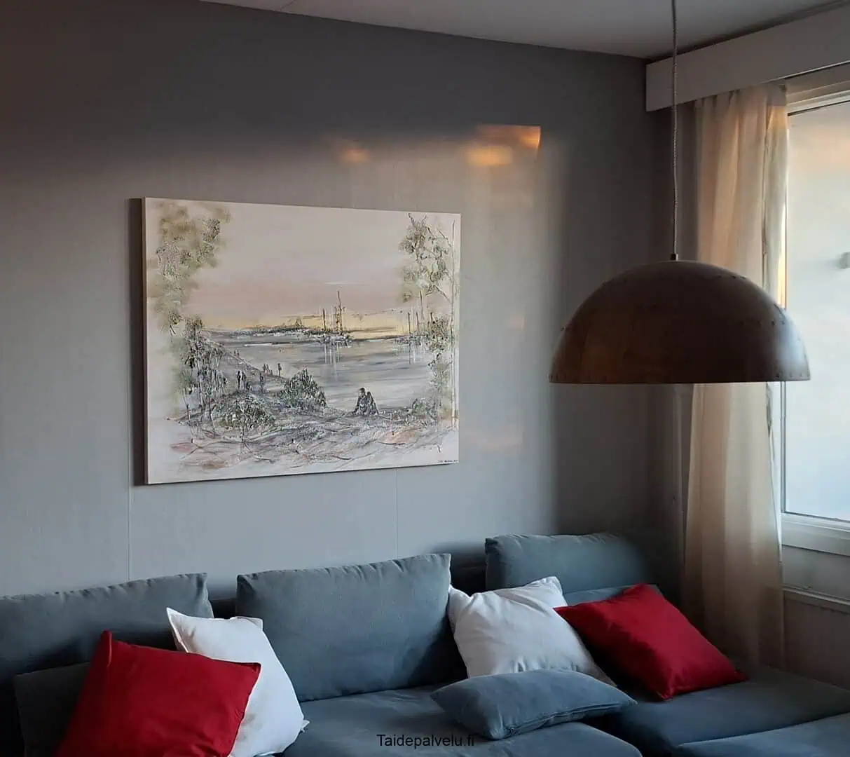 Olohuoneen sisustusta täydentämään valittiin tunnelmallinen Virpi Mäkisen ”Kevätiltana kerran” akryylimaalaus. Seinän värimaailma korostaa loistavasti maalausta ja nostaa upean teoksen huoneen keskipisteeksi. Kiitos kuvan lähettäneelle.